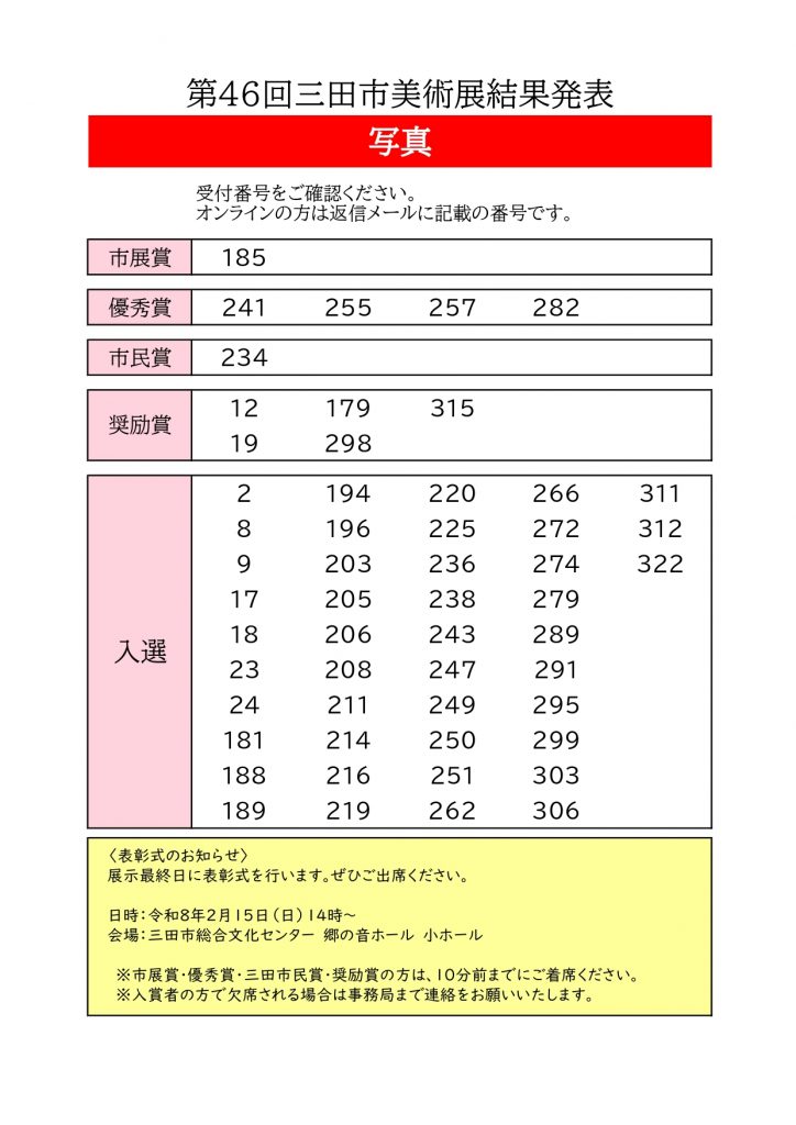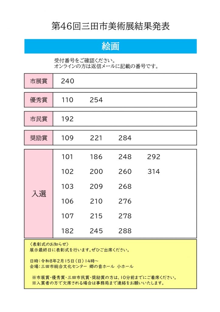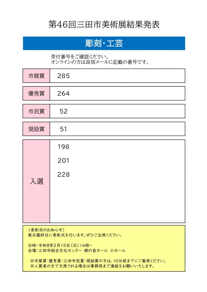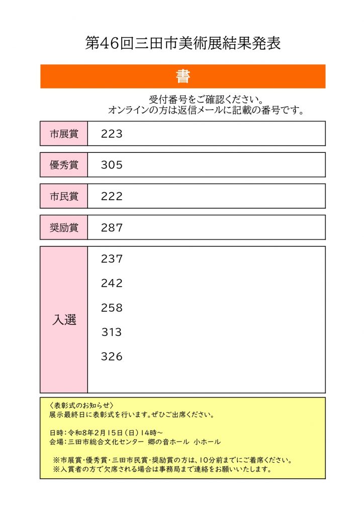 ホーム お知らせ 【第46回三田市美術展 審査結果発表】 【第46回三田市美術展 審査結果発表】 「第46回三田市美術展」に多くのご出展をいただき、ありがとうございました。 厳正な審査の結果、入賞・入選作品が決定いたしましたので、ここに発表いたします。 (投稿日:2026年02月03日) 一覧へ戻る